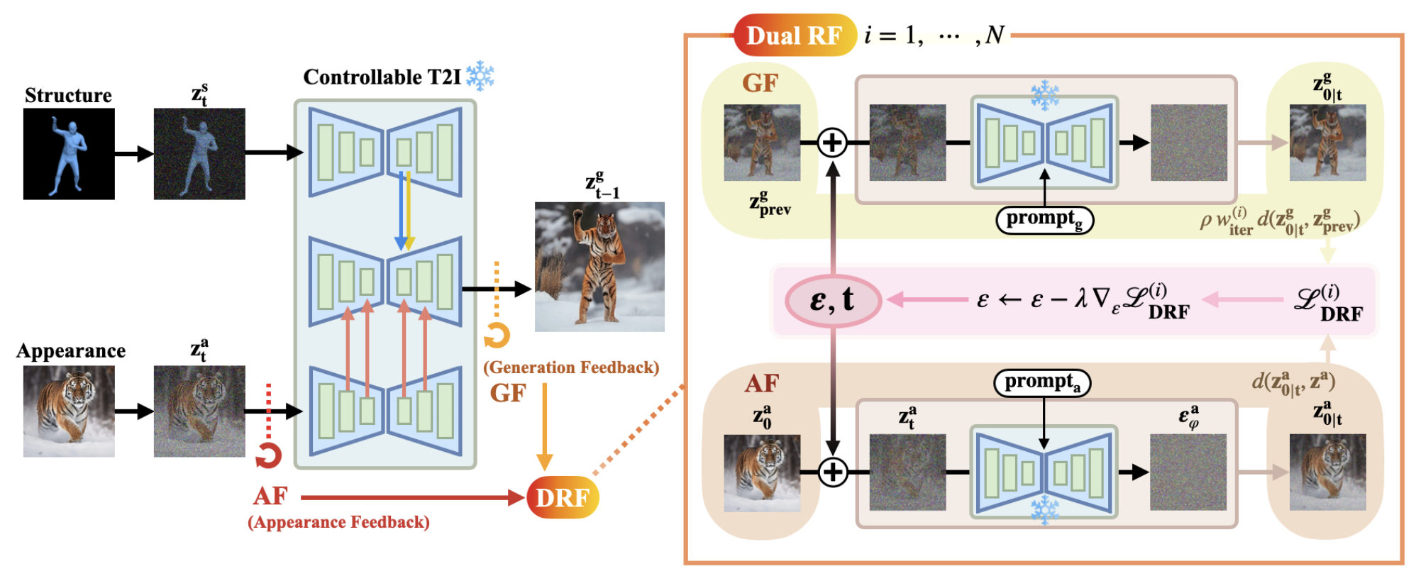 \[\epsilon \leftarrow \epsilon - \lambda \nabla_\epsilon \mathcal{L}^{(i)}_{\text{DRF}}\]여기서 노이즈 $\epsilon$은 $z_{t-1}^g$와 $z^a$에 더해져 $z_t^g$와 $\tilde{\mathbf{z}}_t^a$를 만들며, 이는 geneation과 appearance 사이의 연결점이라고 볼 수 있다. 따라서 IDS와 달리 위 공식과 같이 노이즈 자체를 최적화해 최적의 노이즈를 구해낸다. 이 노이즈를 이용하여 보완된 generative latent를 얻을 수 있다.