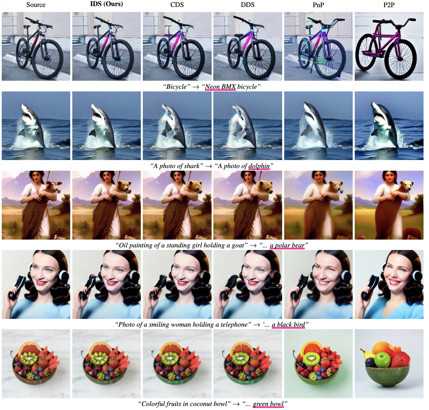 \[\nabla_\theta \mathcal{L}_{\text{IDS}} = \mathbb{E}_{t,\epsilon} \left[ \left( \epsilon_{\phi}^{\omega} \left( \mathbf{z}_{t}^{\text{trg*}}, y^{\text{trg}}, t \right) - \epsilon_{\phi}^{\omega} \left( \mathbf{z}_{t}^{\text{src*}}, y^{\text{src}}, t \right) \right) \frac{\partial \mathbf{z}^{\text{trg}}}{\partial \theta} \right]\]DDS에서 *가 붙은 부분이 수정되어 최종 수식이 나오게 된다.