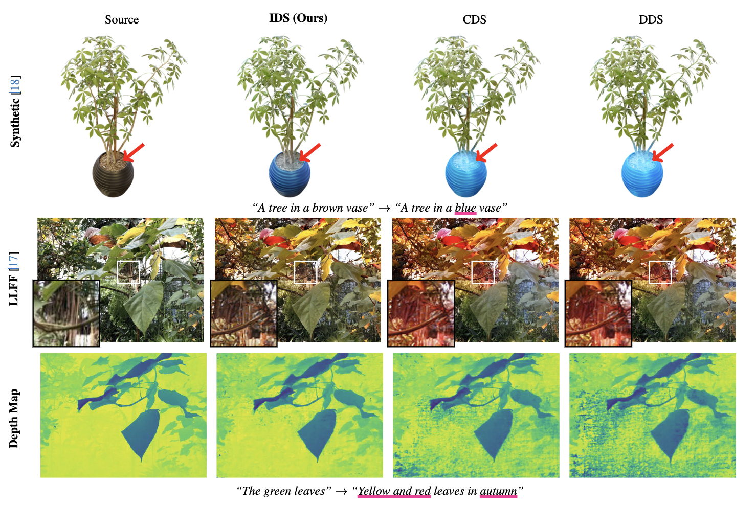NeRF를 수정하는 케이스, 첫번째 행에서 화병 색을 바꾸는 상황에서 나머지 모델들은 흙의 색까지 바꾸지만 IDS는 그러하지 않는다. 두번째 행에서는 잎의 색과 분위기를 바꾸는 상황인데, 이때 나머지 모델은 줄기까지 바꿨지만 IDS는 그러지 않았다. 마지막행은 depth maps인데 이미지 편집 이후에도 노이즈가 적은 깨끗한 depth map을 보여준다.