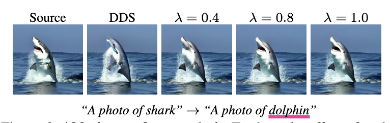 \[\nabla_{\theta} \mathcal{L}_{\text{DDS}} = \mathbb{E}_{t, \epsilon} \left[ \left( \epsilon^{\omega}_{\phi} \left( \mathbf{z}^{\text{trg}}_t, y^{\text{trg}}, t \right) - \epsilon^{\omega}_{\phi} \left( \mathbf{z}^{\text{src}}_t, y^{\text{src}}, t \right) \right) \frac{\partial \mathbf{z}^{\text{trg}}}{\partial \theta} \right]\]DDS는 SDS와 달리 이미지 편집에 특화된 기술로 무에서 유를 창조하는게 아닌, 기존 이미지에서 원하는 부분만 바꾸기 위한 기술이다.