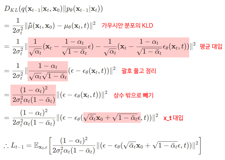 - $L_{T-1}$(이게 가장 중요!) : $q (\mathbf{x}_{t-1} | \mathbf{x}_t, \mathbf{x}_0)$와 $p_\theta (\mathbf{x}_{t-1} | \mathbf{x}_t)$의 KL Divergence의 합, Reverse Process가 이전 스텝의 이미지를 얼마나 잘 복원해내는지를 의미
