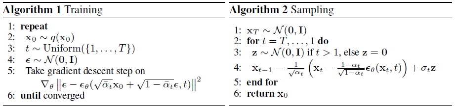 먼저 Training때는 데이터셋에서 $x_0$(원본이미지)를 하나 뽑고, 1부터 T까지의 숫자중 하나를 뽑고, 정답지 역할을 할 가우시안 노이즈($\epsilon$)를 뽑는다. 그리고 위에 있는 Loss function을 이용해 모델을 계속 업데이트 하는 것이다.