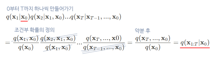 다음 식은 Fowward process를 조건부 결합분포(joint distribution)으로 나타낸 것이다. 이는 마르코프 체인가 현재 상태가 오직 바로 직전 상태에만 의존하고, 그 이전 상태들과는 독립인 원리를 이용해 식을 다음과 같이 변형 시킨 것이다.