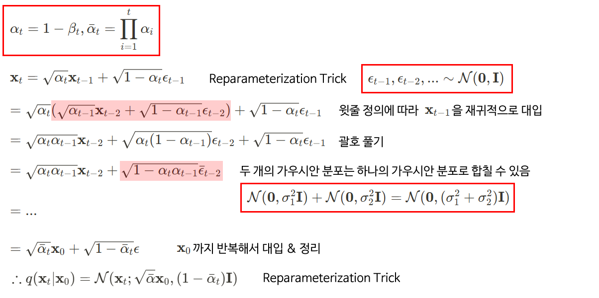 \[q(\mathbf{x}_t | \mathbf{x}_0) = \mathcal{N}(\mathbf{x}_t; \sqrt{\bar{\alpha}_t}\mathbf{x}_0, (1 - \bar{\alpha}_t)\mathbf{I})\]foward process는 학습되는 프로세스가 아니다. VAE에서 사용했던 reparameterization trick를 적용하여 $x_0$에서 특정 시점 t에서 노이즈가 추가된 이미지 $x_t$를 다음 공식을 통해 바로 얻어 낼 수 있다. 증명은 아래 이미지와 같다.