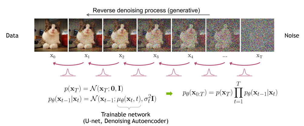 \[p_{\theta}(\mathbf{x}_{0:T}) := p(\mathbf{x}_T) \prod_{t=1}^{T} p_{\theta}(\mathbf{x}_{t-1}|\mathbf{x}_t),\]reverse process 또한 마르코프 체인으로 표현할 수 있으며, 살짝 식이 다른 모습을 볼 수 있다.