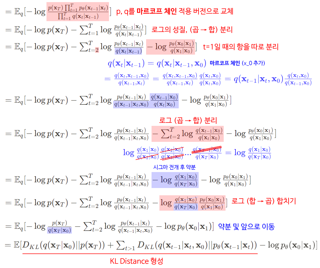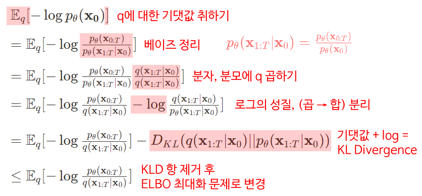 \[\mathbb{E}[-\log p_\theta(\mathbf{x}_0)] \leq \mathbb{E}_q\left[-\log \frac{p_\theta(\mathbf{x}_{0:T})}{q(\mathbf{x}_{1:T}|\mathbf{x}_0)}\right] = \mathbb{E}_q\left[-\log p(\mathbf{x}_T) - \sum_{t \geq 1} \log \frac{p_\theta(\mathbf{x}_{t-1}|\mathbf{x}_t)}{q(\mathbf{x}_t|\mathbf{x}_{t-1})}\right] =: L \quad (3)\]다시 한번 요약하자면 다음과 같이 작성할 수 있고