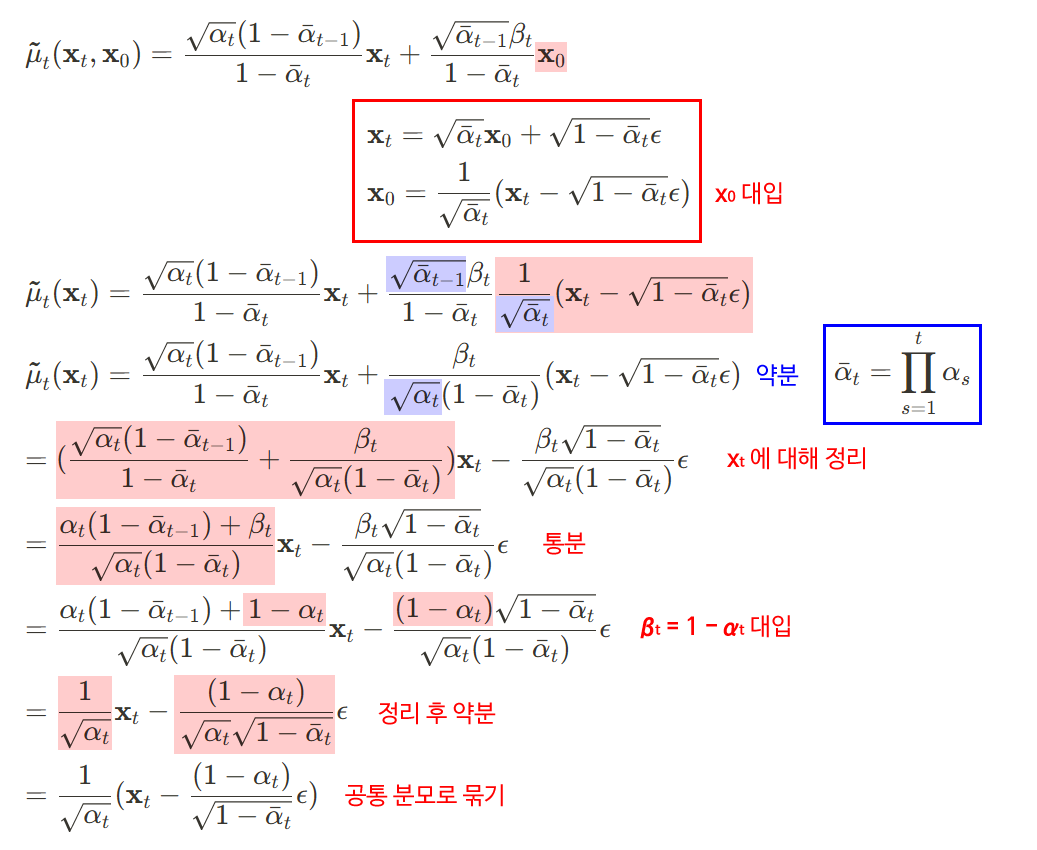 \[\mu_\theta(\mathbf{x}_t, t) = \frac{1}{\sqrt{\alpha_t}} \left( \mathbf{x}_t - \frac{1-\alpha_t}{\sqrt{1-\bar{\alpha}_t}}\epsilon_\theta(\mathbf{x}_t, t) \right)\]가 된다.