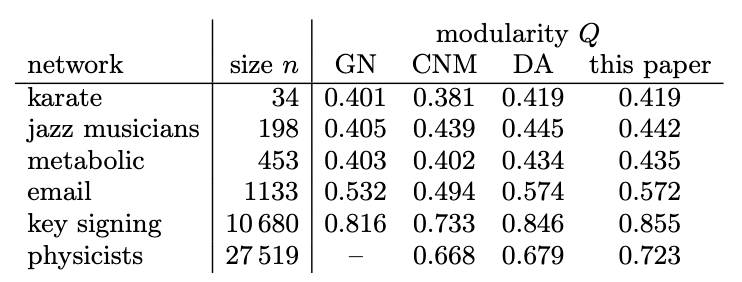 - 실세계 데이터에 적용을 했을때 합리적인 커뮤니티 분할을 제공했으며, modularity value 측면에서도 좋은 성능을 보였다.