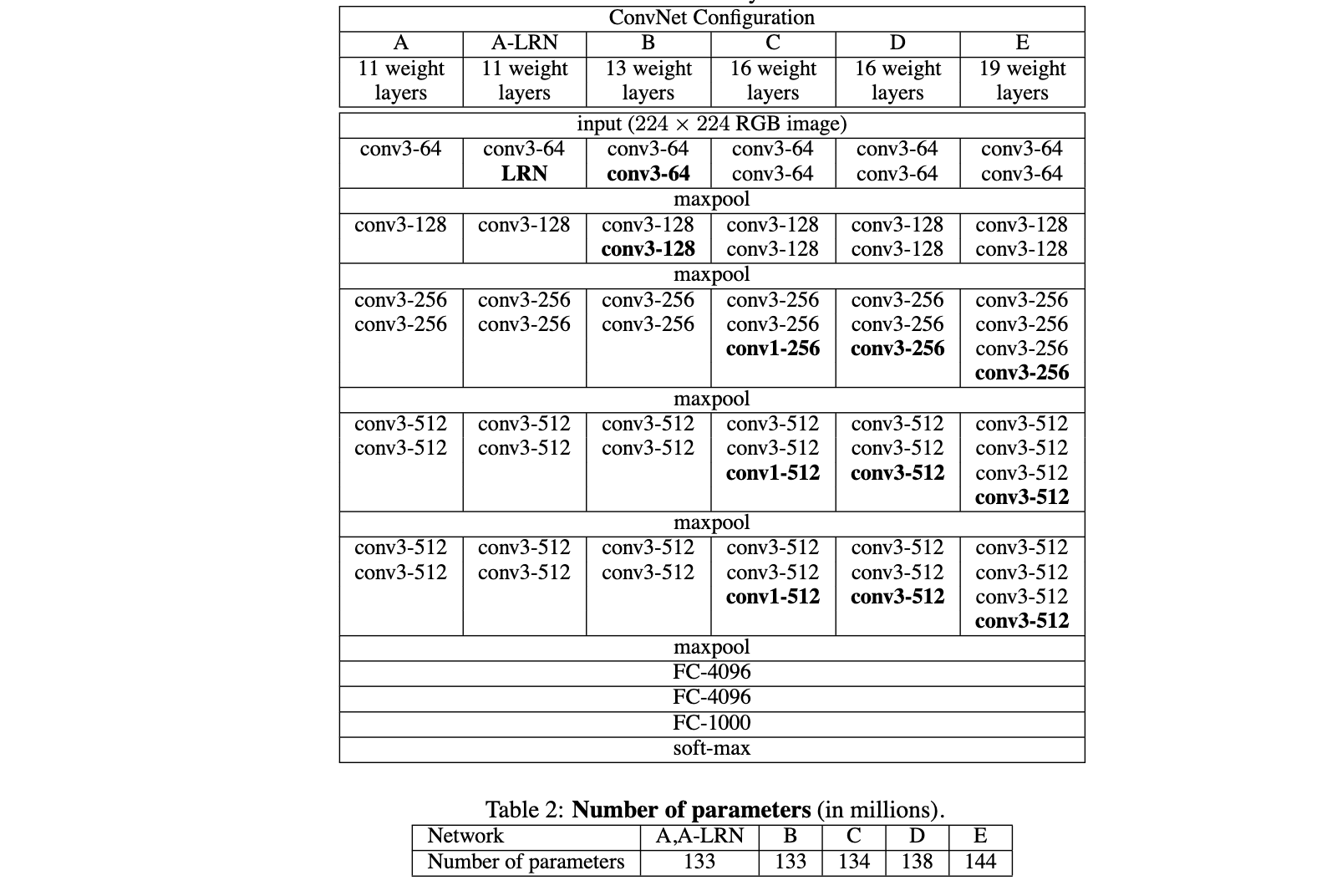 해당 논문에서는 위 아키텍처를 위 표와 같이 구성하였다. 하나의 Column이 하나의 모델 아키텍처를 의미한다. 모든 모델의 아키텍처 특징은 위에 기술한 바와 같고, LRN의 적용여부와 레이어 수에 차이가 있다. 점점 레이어를 지나면서 Conv Layer의 채널이 증가하는데 이를 논문에서는 conv layer의 width가 증가한다고 하고 있다. 그리고 테이블2에서는 각 모델 구성에 대한 파라미터 수를 기술하고 있다. 여기서 모델이 더 깊어짐에도 불구하고 필터수가 적고(layer width가 적고) receptive field가 적기(필터 크기가 3x3로 작기) 때문에 파라미터의 수가 크게 증가하지 않는다.