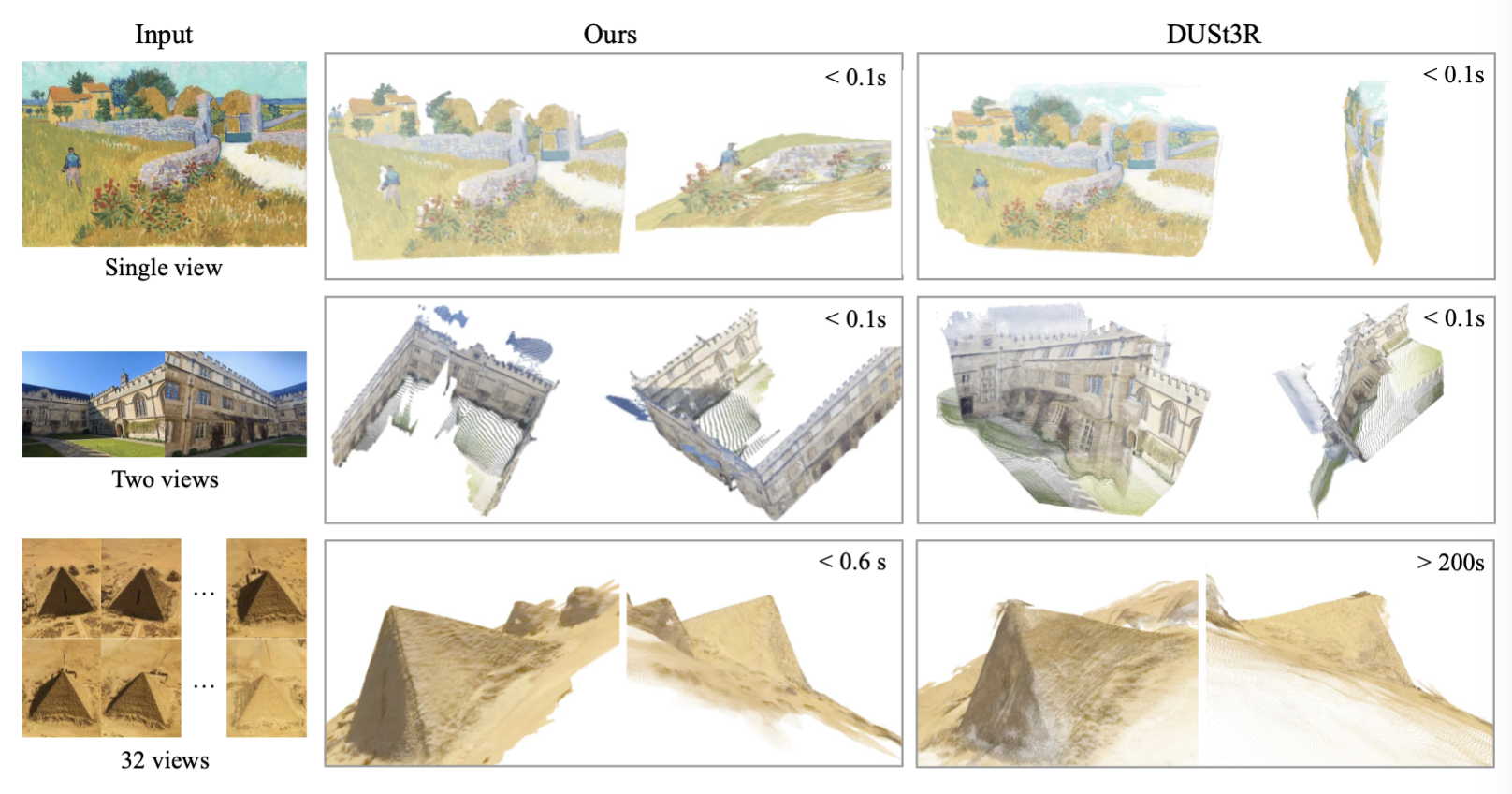 이중에서 learning-based 방식은 최근 큰 발전을 이루었다. 대표적으로 DUSt3R와 MASt3R이 있으며 기존의 MVS와 다르게 카메라 파라미터 없이 몇장의 사진만으로 dense point cloud를 만들어낼 수 있다.