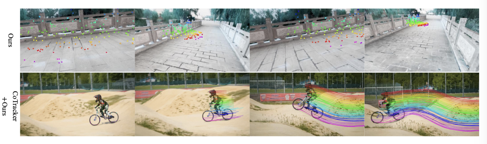 tracking의 경우 이미지의 한 점이 다른 이미지의 어디로 이동했는지를 정확히 맞췄는지 보고 판단한다. 이때 예측한 좌표와 정답 좌표 사이의 거리를 합산하고, CoTracker2의 방식에 따라 점이 가려졌는지 맞추는 Binary Cross-Entropy도 포함된다.
