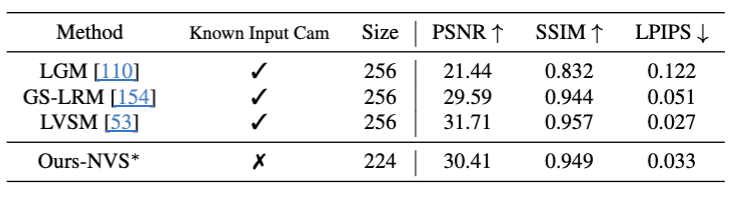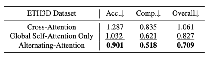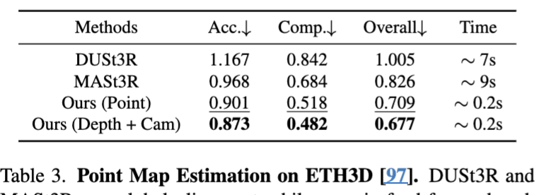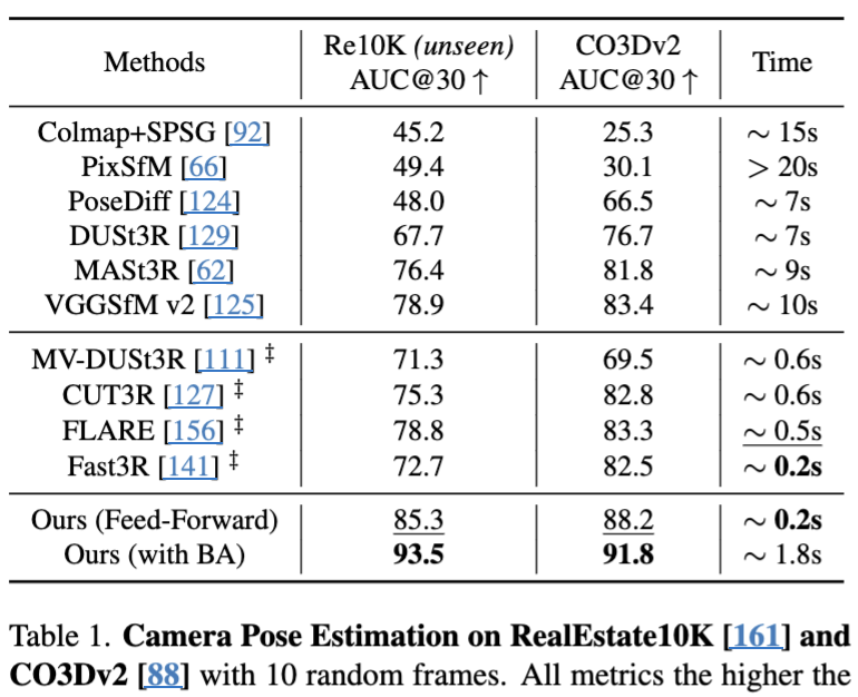 카메라 파라미터의 경우 Feed-forward 방식의 경우 가장 빠르면서도 가장 좋은 성능을 냈으며, BA와 같은 visual geometry optimization을 적용한 경우 속도는 느려졌지만 더 좋은 성능을 보였다.